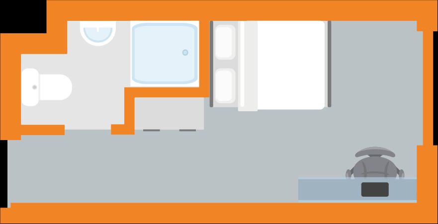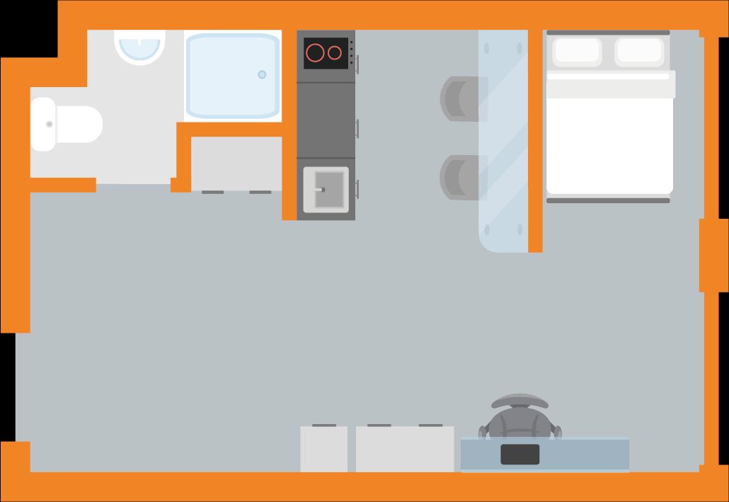 If you’re looking for extra space and modern comfort, the Deluxe Studio offers 24.2m² to 27.5m² of functional and stylish student living. This studio includes a ¾ size double bed with under-bed storage, a headboard with an integrated lamp and USB socket, a study desk with drawer space and chair, bookshelf storage, a pinboard, a full-length mirror, a wardrobe, and coat hooks. The private en-suite bathroom features a shower and WC, giving you complete privacy. The kitchen area, equipped with a 2-ring electric induction hob, electric oven, fridge with freezer compartment, and a dining area, makes cooking easy and convenient. Book your Deluxe Studio today and enjoy the perfect mix of space and style!