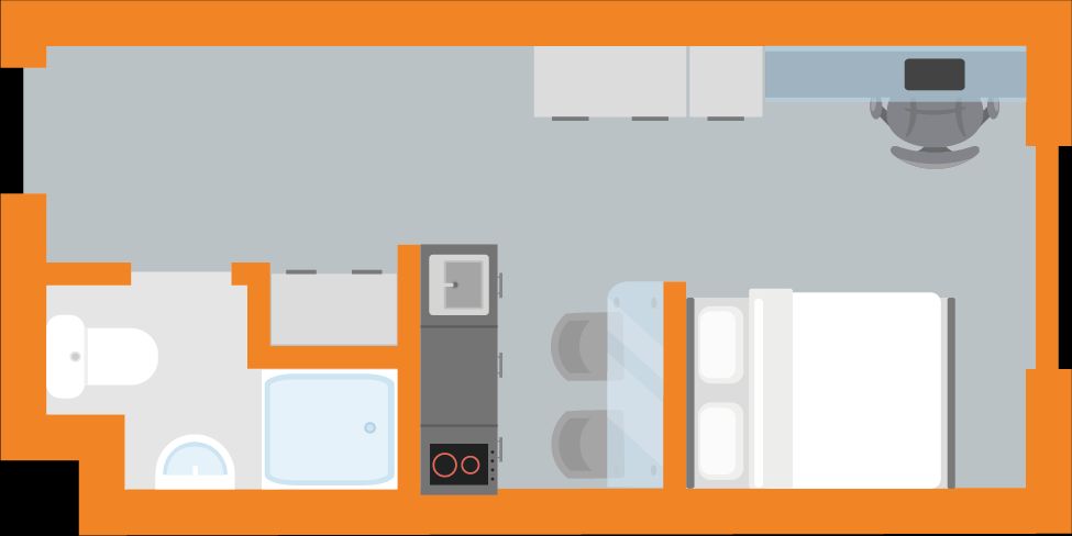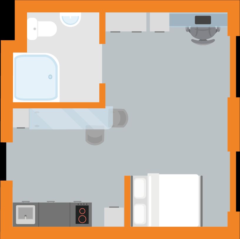 The Premium Studio is perfect for students looking for a balance of space and comfort, offering room sizes between 19.6m² and 20.8m². Inside, you’ll find a ¾ size double bed with under-bed storage, a study desk with drawer space and chair, bookshelf storage, a pinboard, a full-length mirror, a wardrobe, and coat hooks. The private en-suite bathroom features a shower and WC. The kitchen area includes a 2-ring induction hob, electric oven, fridge with freezer compartment, and a dining area, making it ideal for self-contained living. Book your Premium Studio today and enjoy modern, private living!