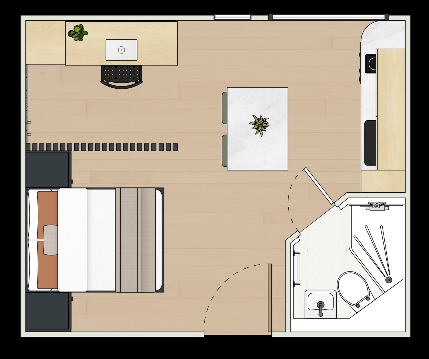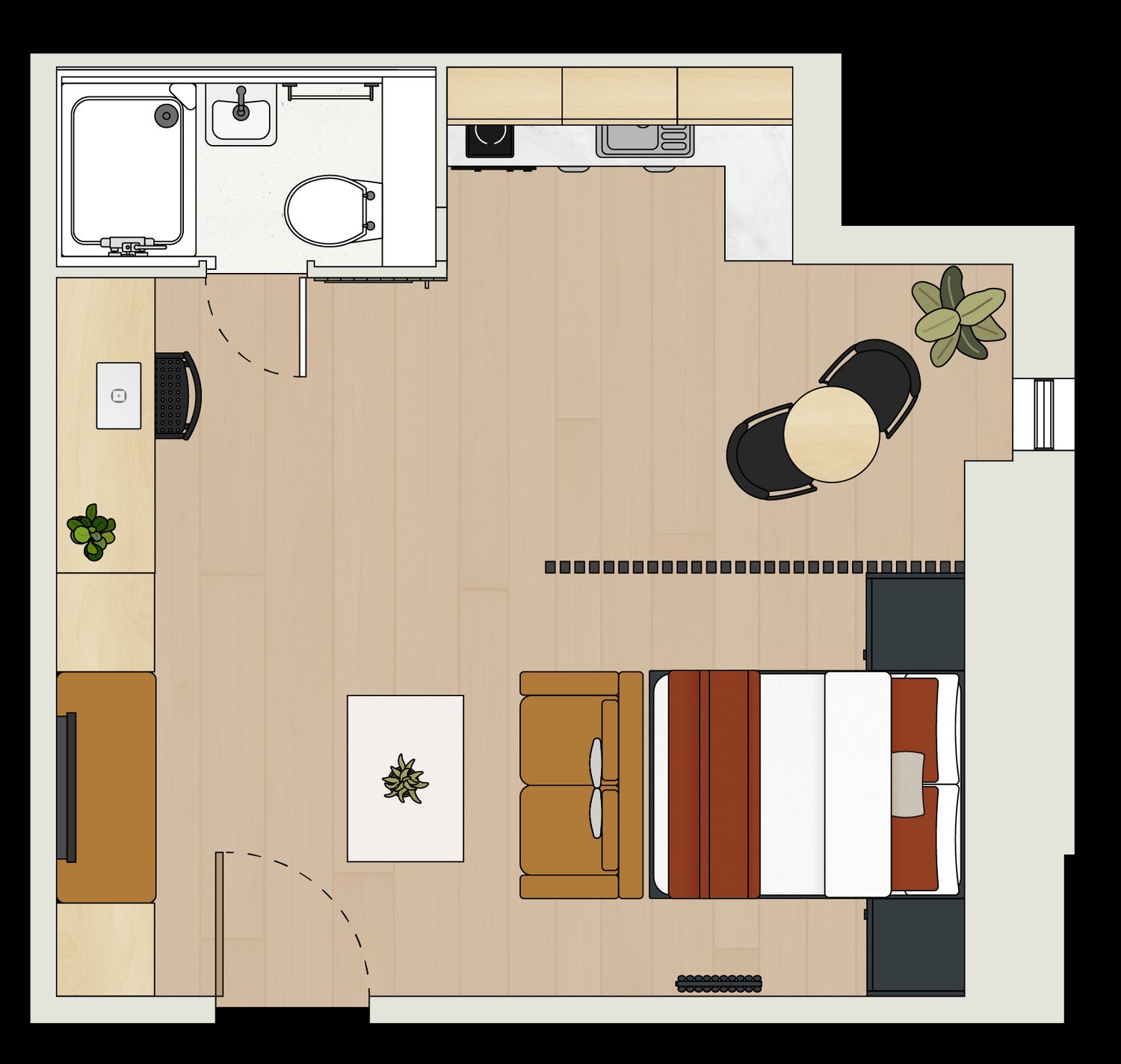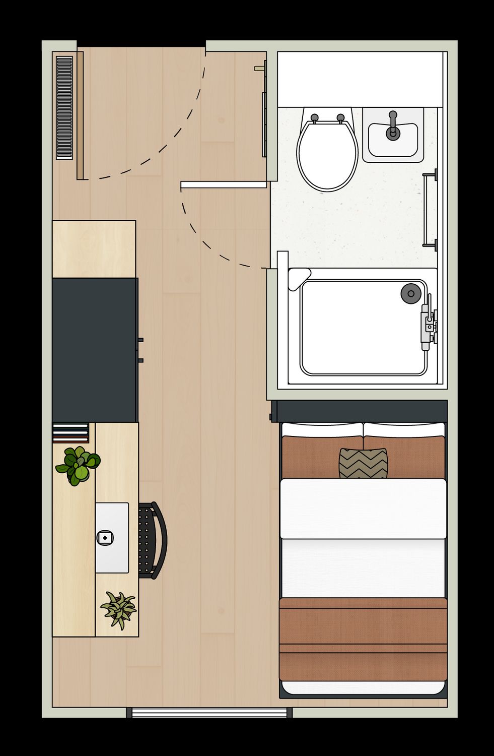 Extra room, extra comfort. The Premium Studio, Top Floor gives you everything the Classic Studio offers—your own en-suite, fully equipped kitchenette, and cozy furnishings—plus more space to stretch out. Perfect for those who need a little more room to breathe, this studio balances style and practicality, providing all the thoughtful design details you love with added flexibility for lounging, studying, or hosting.