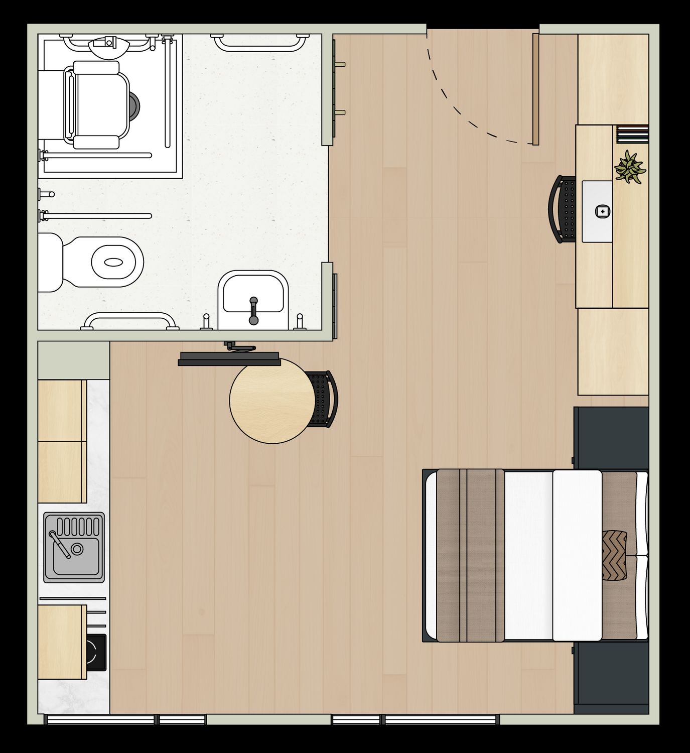 Our Accessible Studio, Ground Floor, Light, airy, and designed for more. The Deluxe Studio offers extra home office space and abundant natural light, making it the perfect choice for students who need a bit more flexibility in their living arrangement. Suitable for single or dual occupancy, it combines style and practicality, with a fully equipped kitchenette, en-suite bathroom, and thoughtful design. It’s a personal retreat where work and relaxation come together effortlessly.