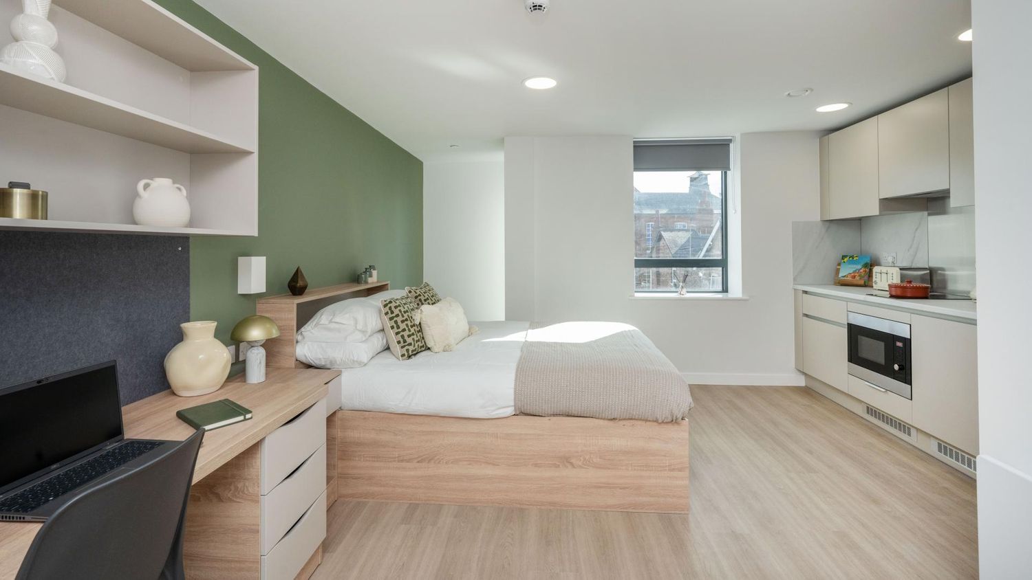 Premium Studio (Ground Floor, 26.8 m²) offers a spacious, modern environment designed to balance comfort and functionality. Each studio features a comfortable bed, a private en-suite bathroom, and a dedicated study area with a desk and chair for focused work. The private kitchen includes a hob, microwave, sink and ample storage space for all your essentials, ensuring easy meal preparation and convenience. A large wardrobe helps keep your room neat and organised, creating the perfect setting for both study and relaxation.