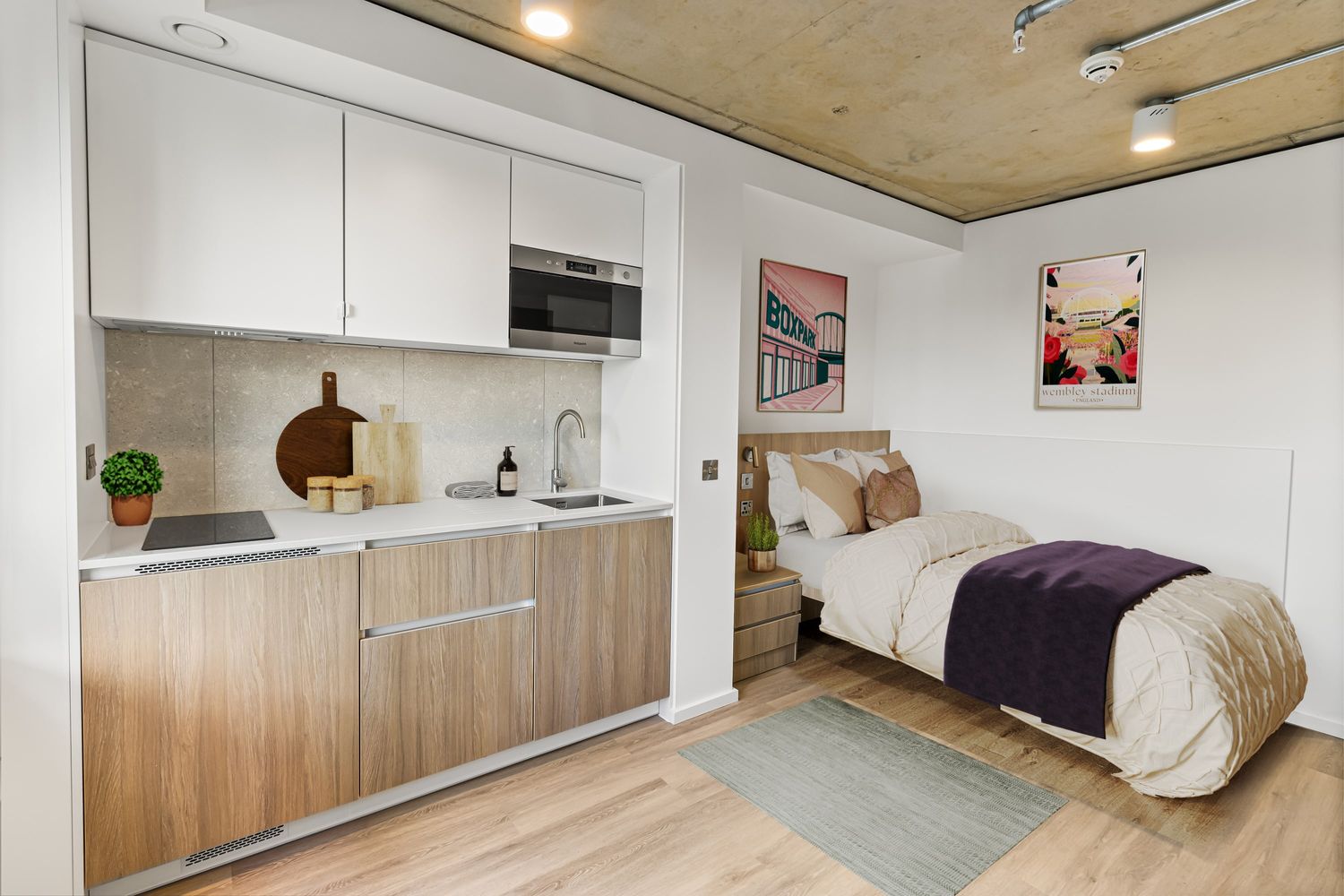 Study desk & chair. Wardrobe & additional storage space. Private kitchen with cooking facilities, fridge/freezer & sink. Private bathroom with shower, toilet & basin. Small double bed.