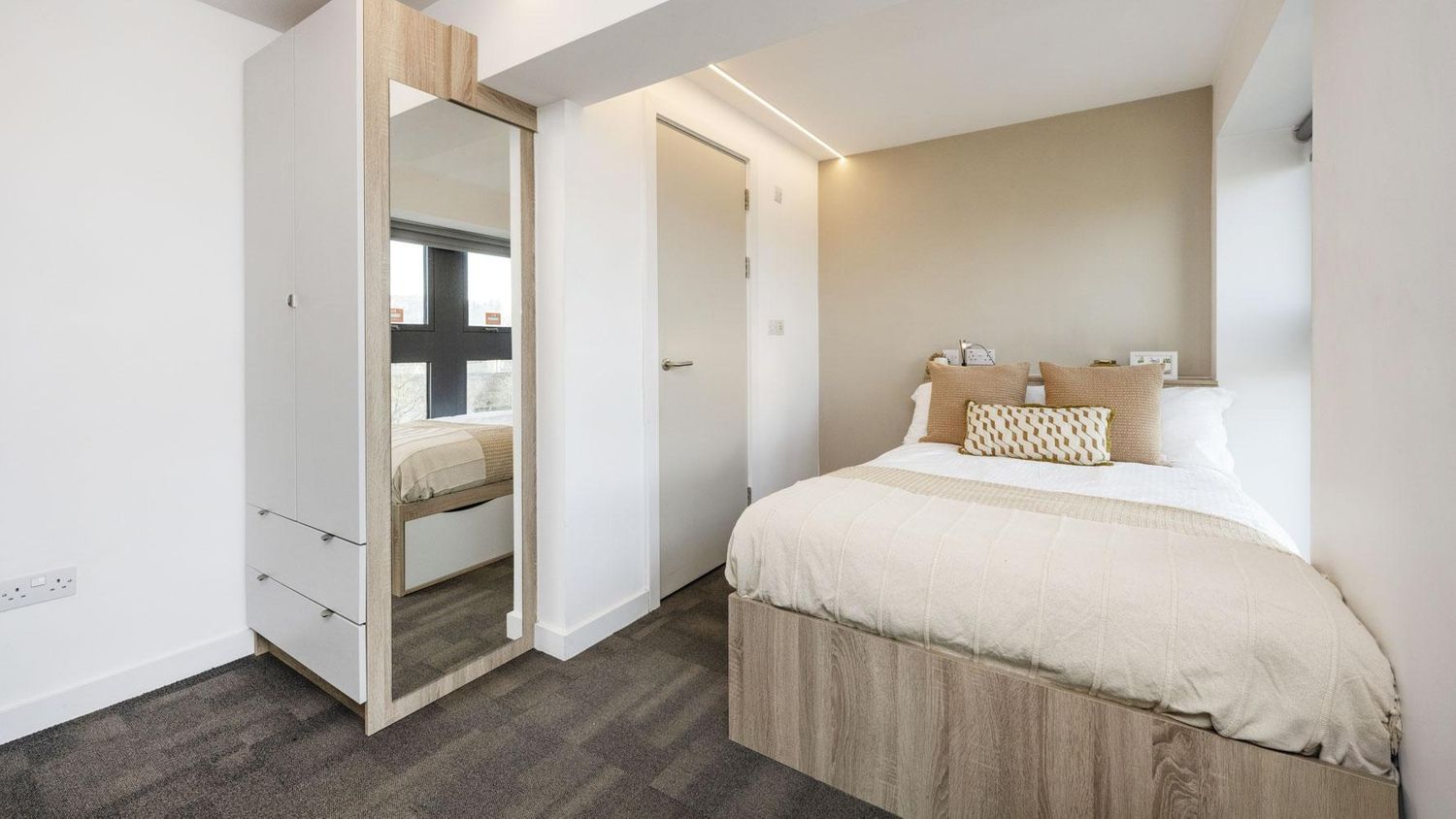 This ensuite option gives you a small double bed and private bathroom, plus all the essentials to feel settled: a large desk and chair, pinboard, wardrobe, and full-length mirror. You’ll also share a kitchen with others in your flat, offering a good balance between privacy and connection. Book your Superior Ensuite today.