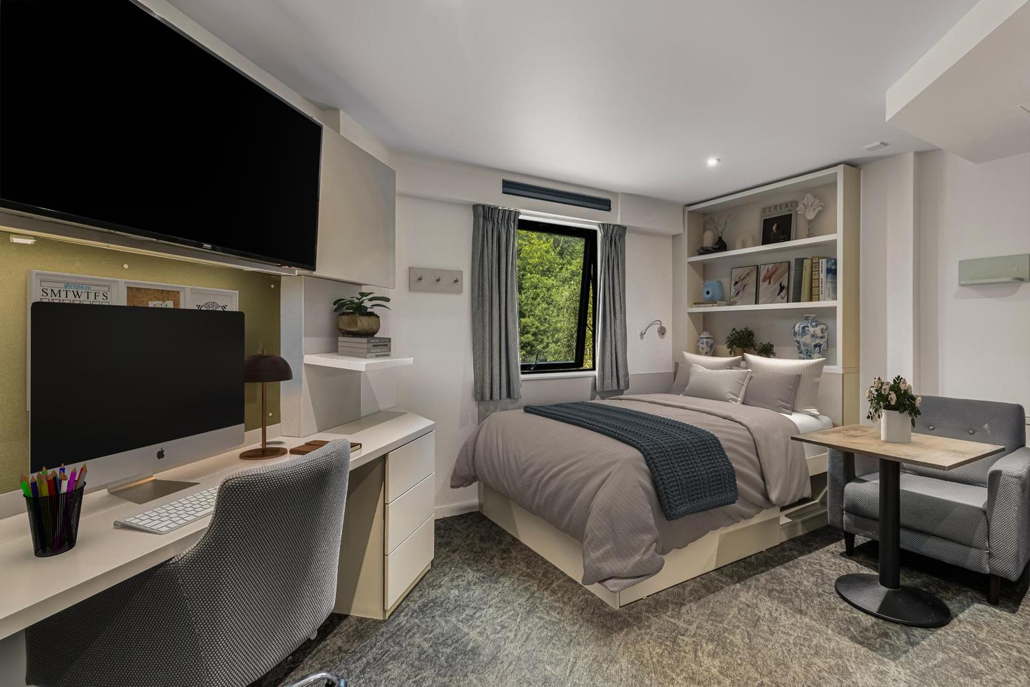 A studio designed for comfortable student living. Alongside your private bathroom and kitchenette, there’s space to study, relax and settle into a day-to-day routine that works around your schedule. Includes your own TV. Images are for illustration purposes only.