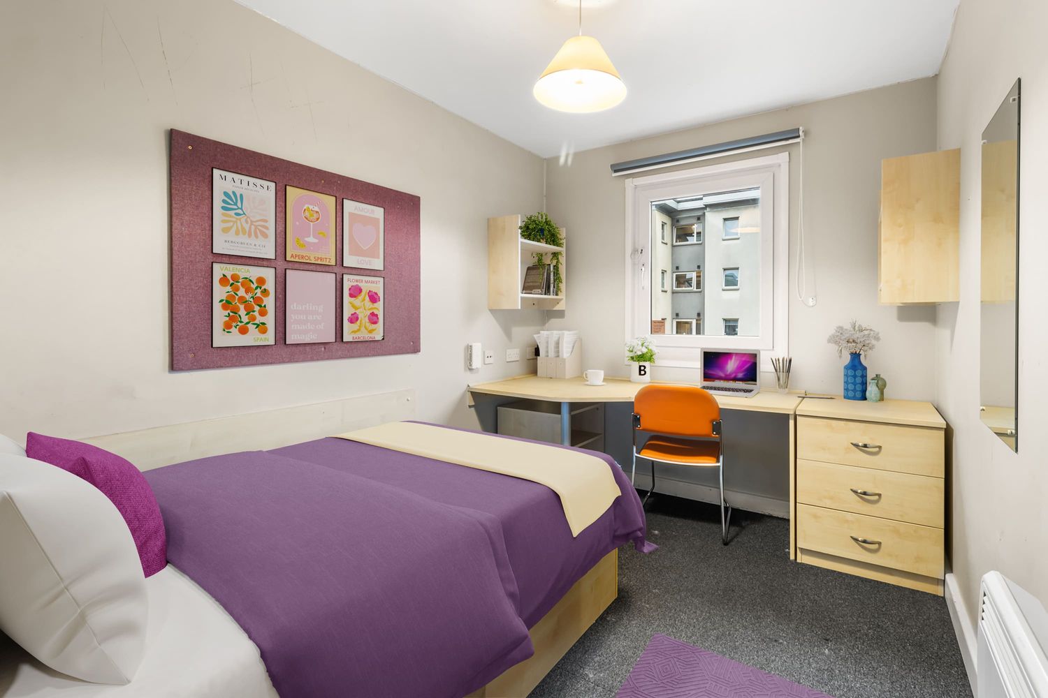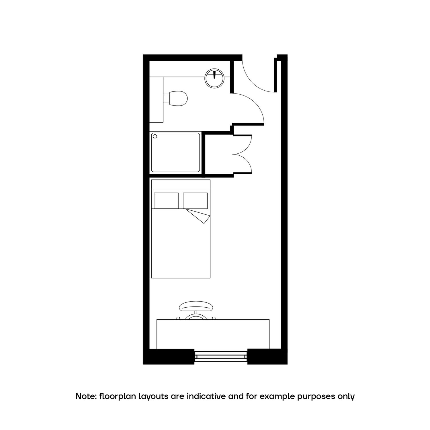 Study desk & chair. Wardrobe & additional storage space. Shared kitchen & dining area. Private bathroom with shower, toilet & basin. Small double bed.