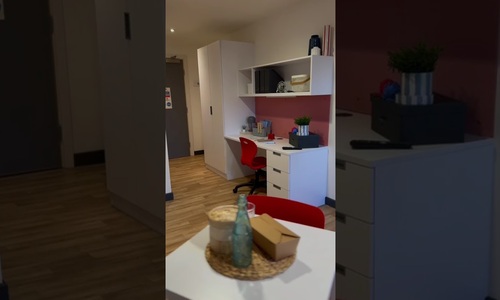 Room sizes vary between approximately 18.9m²-19.4m². Rooms are located on the upper ground floor.What’s in the room?Your own private studioPrivate en-suite with showerDouble bedWardrobeStudy desk, chair and storageNoticeboardYour own kitchen with storageDining table with chair