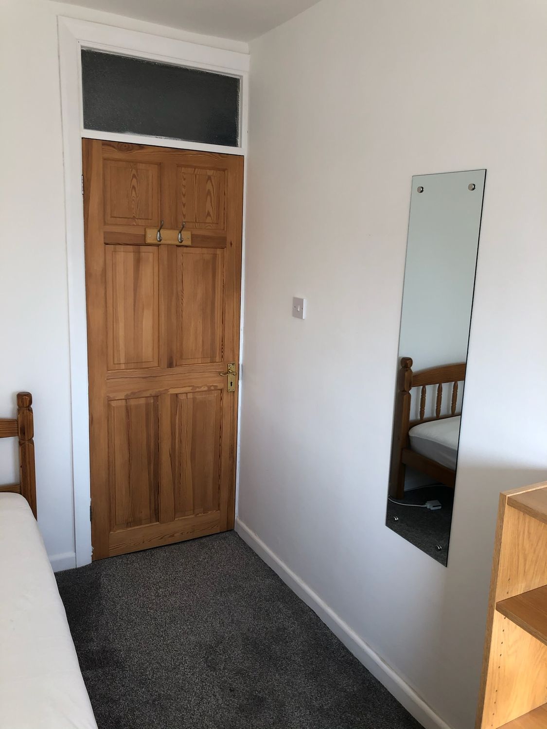 Room 1 downstairs at 102 Gerard Avenue. Offered fully furnished with a single bed, bedside cabinet, double wardrobe, large study desk with under desk drawer storage, comfortable adjustable office chair, tall book shelf, lamp and mirror. Carpeted room and finished to a clean modern standard. Blackout blinds for privacy downstairs at the front of the house.