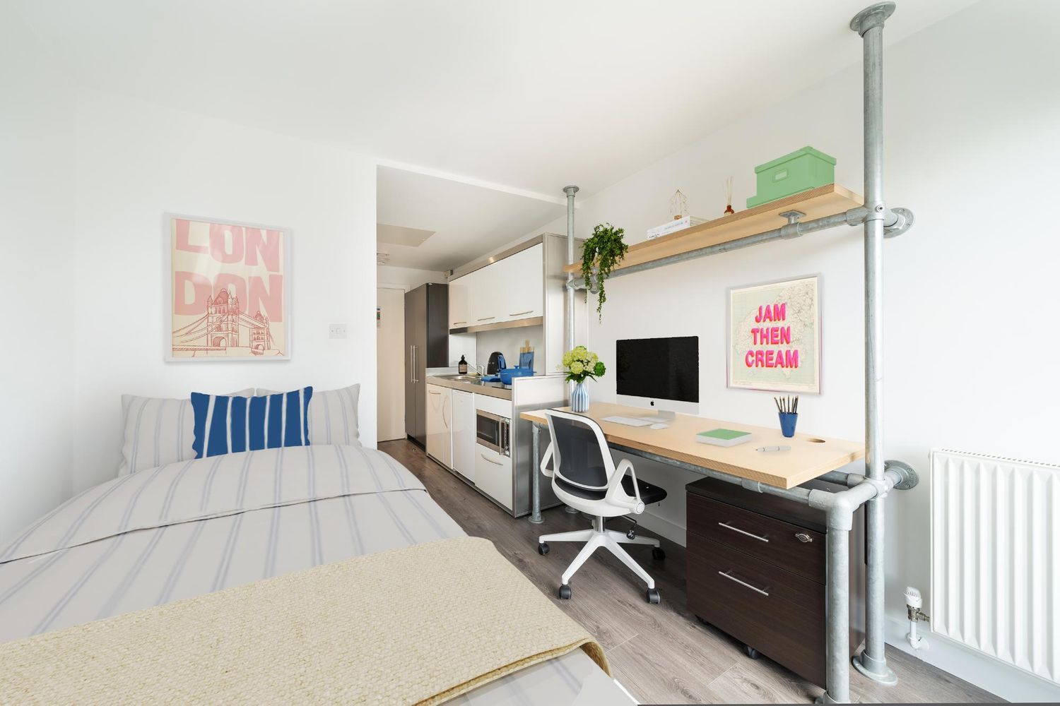 A spacious, generously sized studio designed for comfortable living. Enjoy your own private bathroom or wet room, study area, and kitchenette, with plenty of room to settle in and relax in an open, airy space filled with natural light. Images are for illustration purposes only.