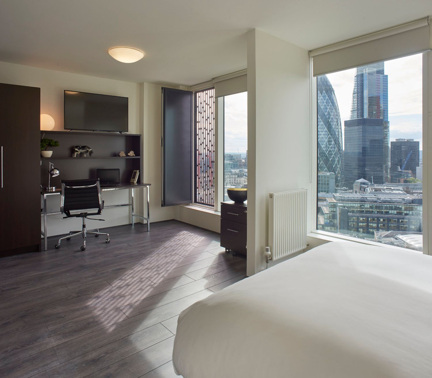 A generously sized studio, the largest available, offering exceptional space and comfort. Located on the lower floors, each includes a spacious bathroom or wet room, study area, and private kitchenette, with plenty of space to relax and enjoy an open feel. Images are for illustration purposes only.