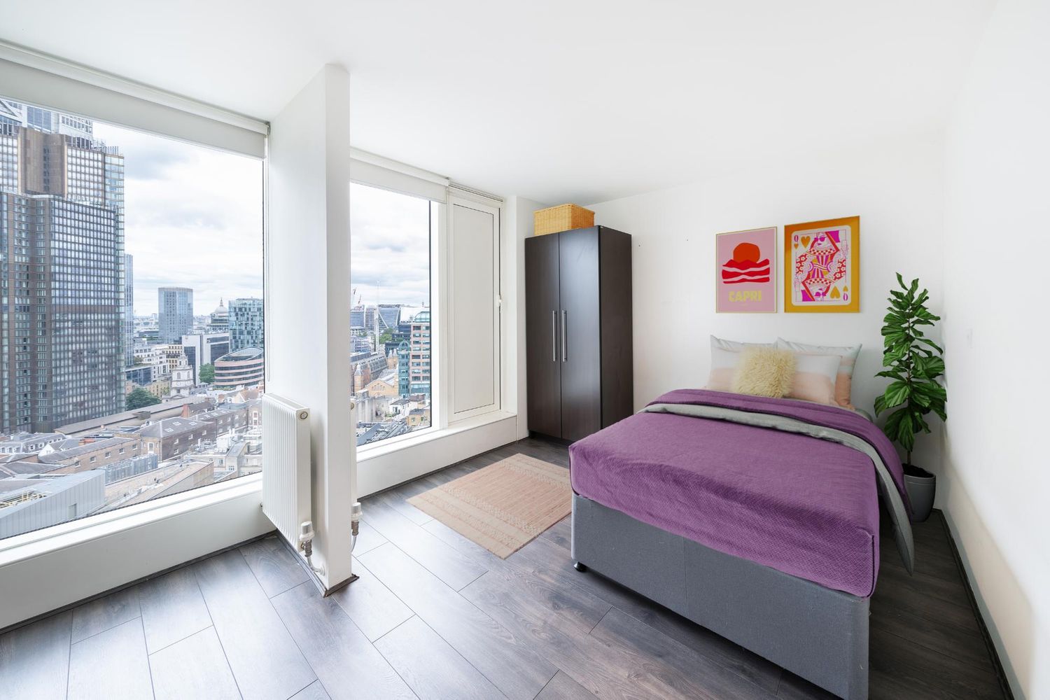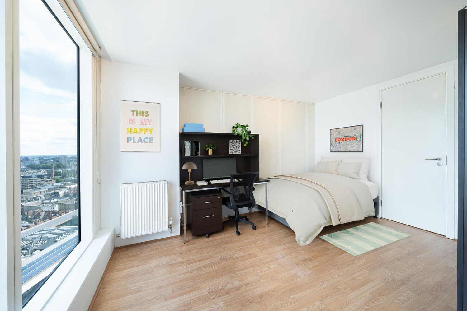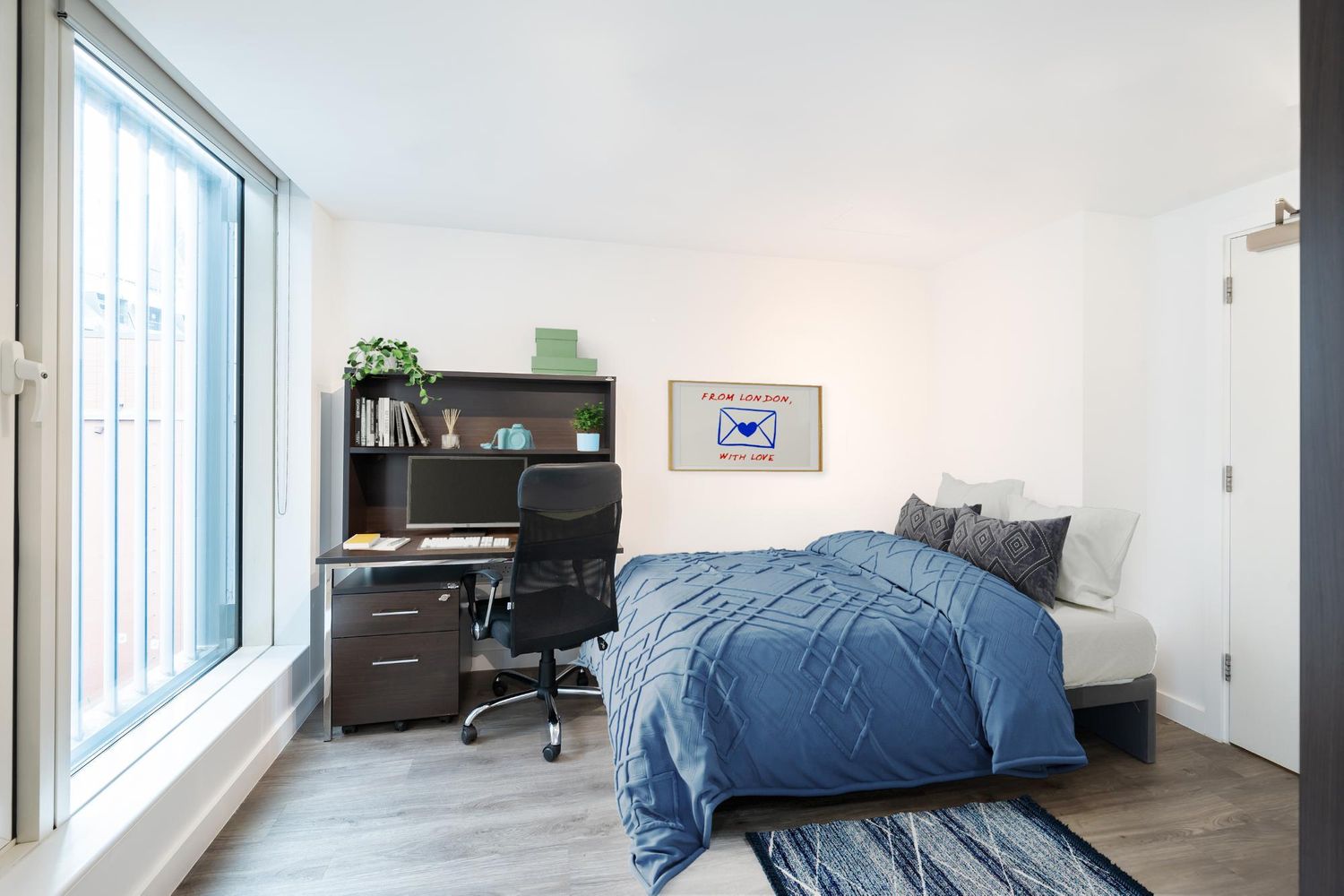 A private bedroom in a shared apartment, with access to a shared bathroom, kitchen and bright living spaces with a TV included. It suits students who like having their own space while sharing day-to-day living with a small group. Images are for illustration purposes only.