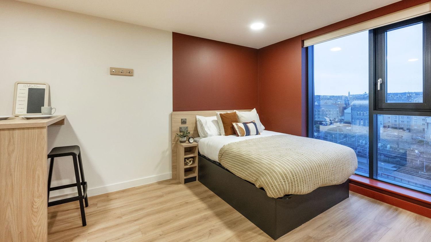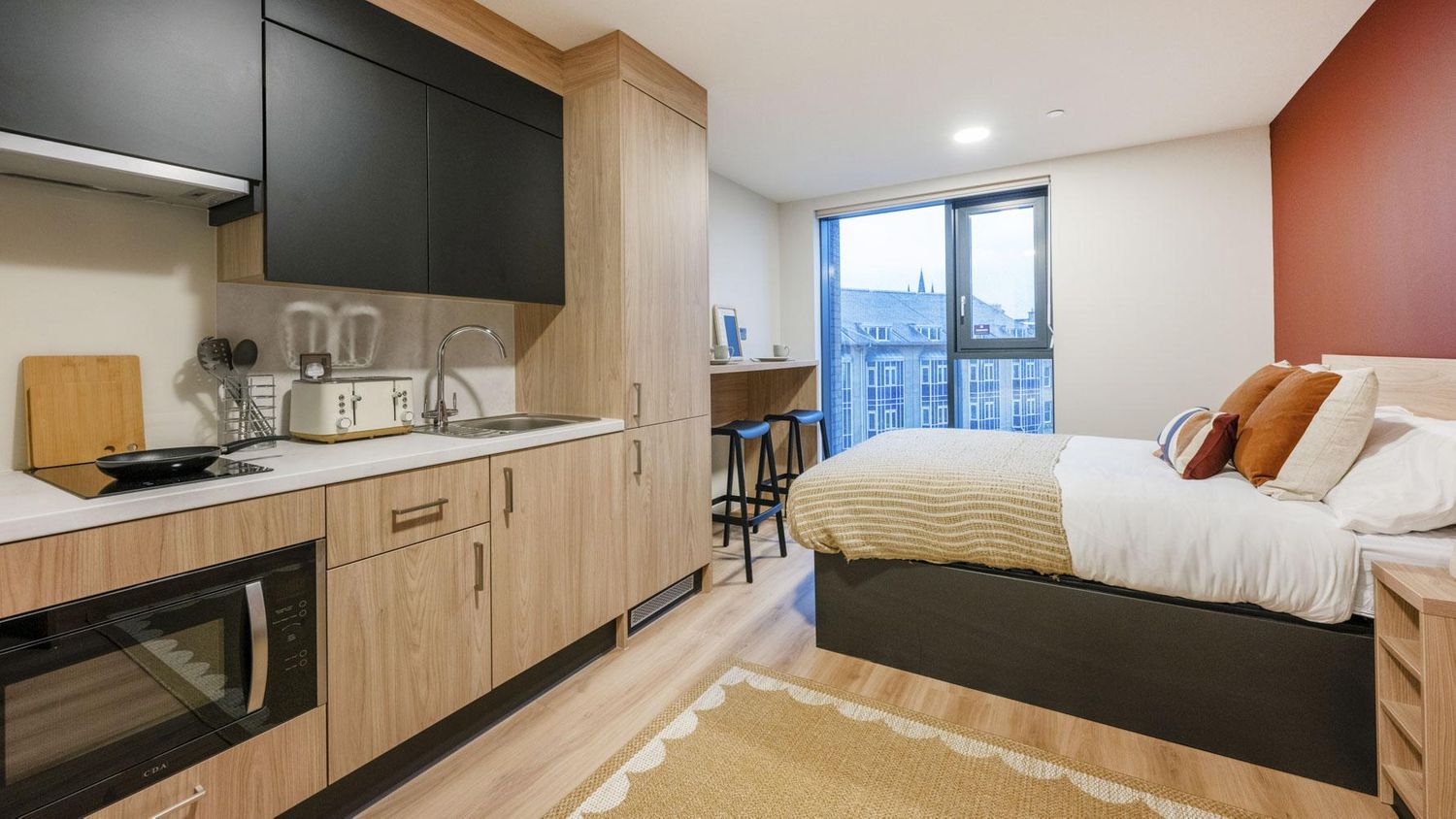 Accessible Studio (1st floor, 25.6 m²) is designed for accessibility, comfort and independence. The studio includes a comfortable bed, accessible en-suite wet-room, a dedicated study desk and chair, and ample storage. The private kitchen is equipped with a hob, oven and fridge with freezer compartment for convenient meal preparation. A welcoming, practical space that balances comfort with inclusive design.
