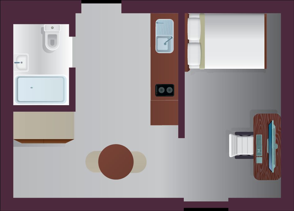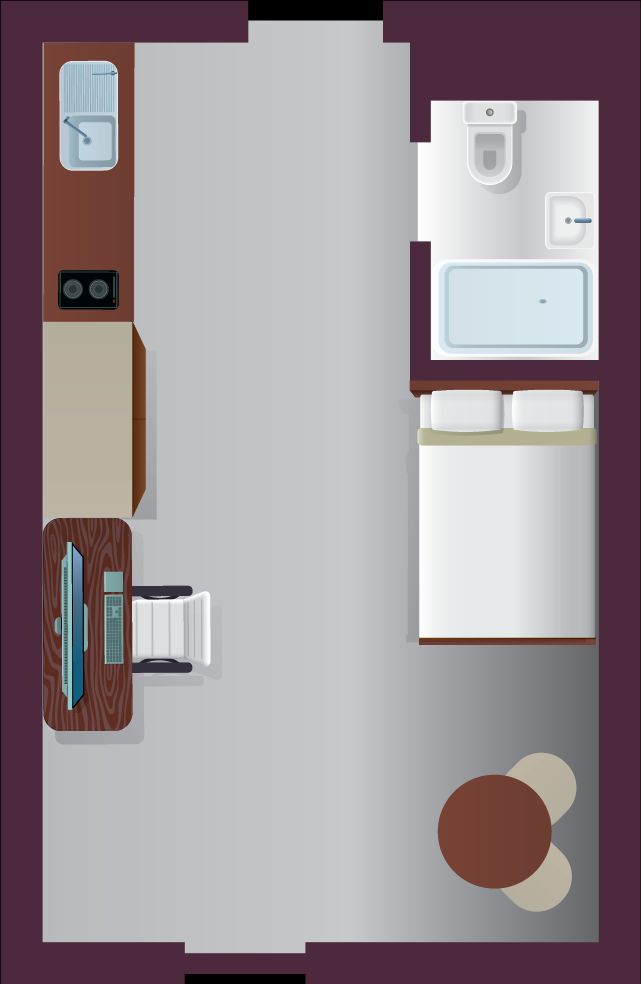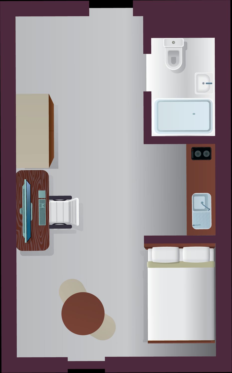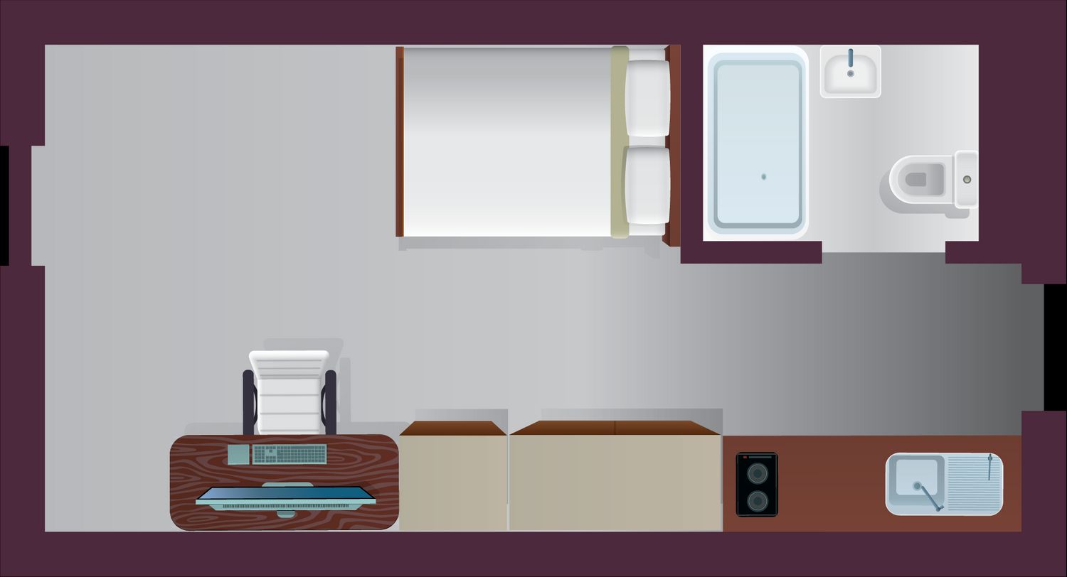 The Large Classic Studio offers 20–22 m² of spacious, self-contained living. It features a ¾ double bed with under-bed storage, study desk and chair, wardrobe, and extra storage with drawers and shelving. Your private kitchen includes ceramic hobs, combi oven, fridge freezer, and a dining table with chairs, plus a private en-suite bathroom and air conditioning for all-season comfort.