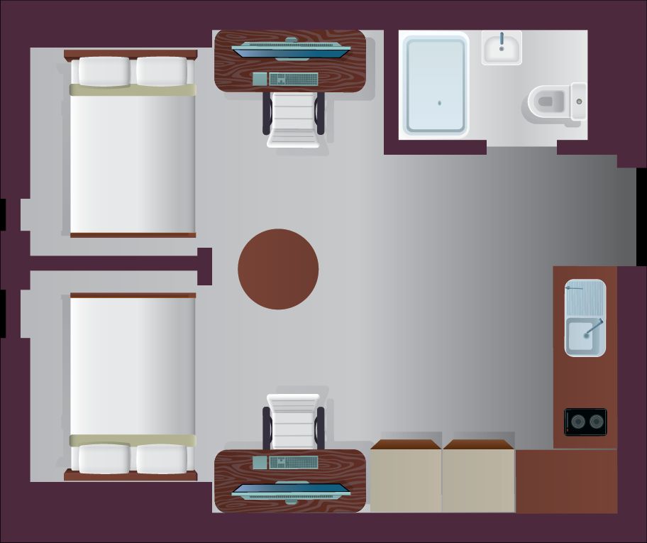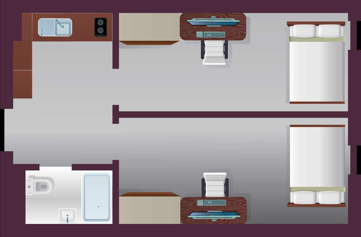 The Large Twin offers 25–30 m² of bright, well-designed shared space. It features two ¾ double beds with under-bed storage, two study desks with chairs, and plenty of storage with a wardrobe, drawers, and shelving. Enjoy a shared kitchen with ceramic hobs, combi oven, fridge freezer, and a dining table, plus a private en-suite bathroom and air conditioning for year-round comfort.