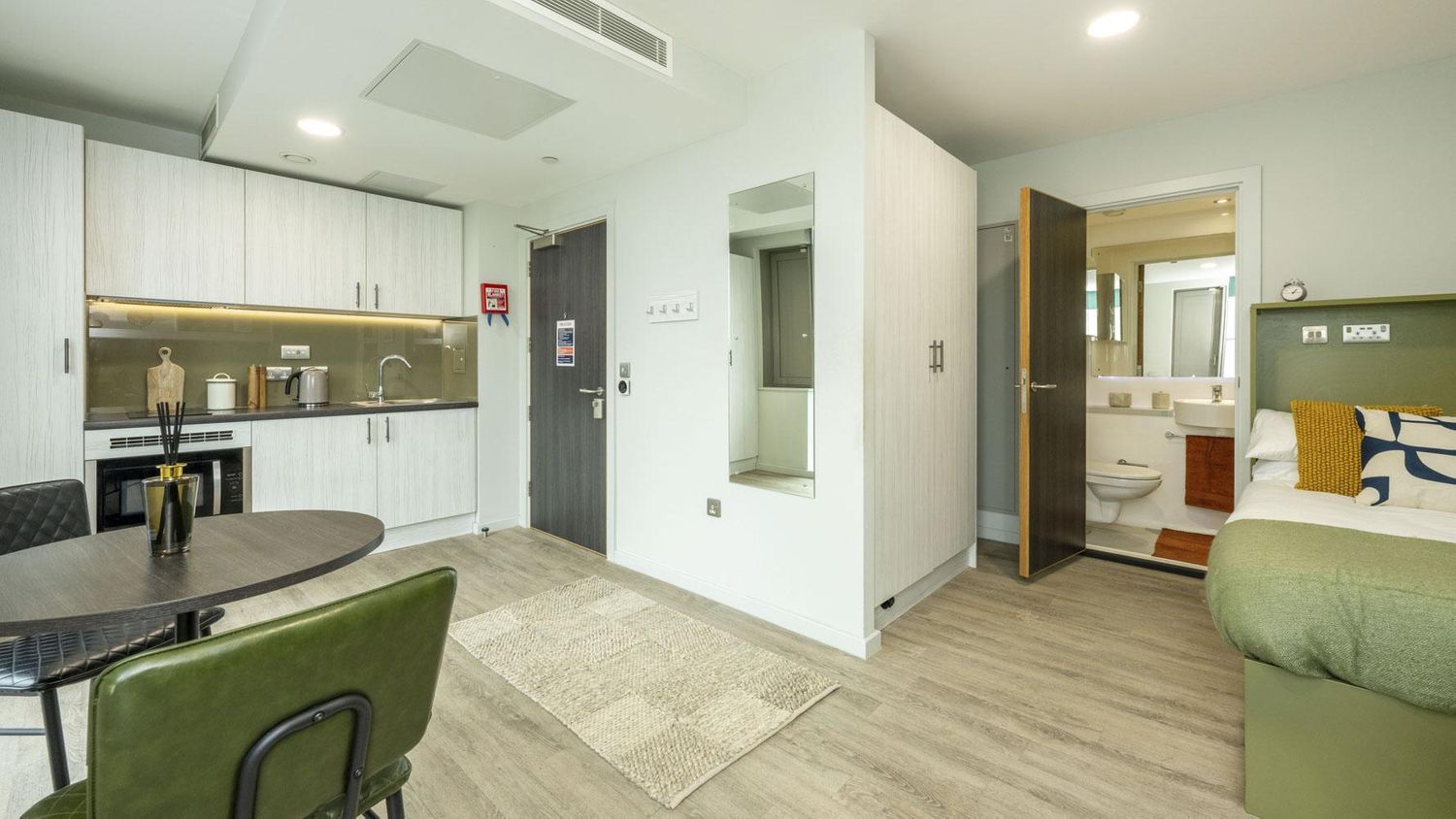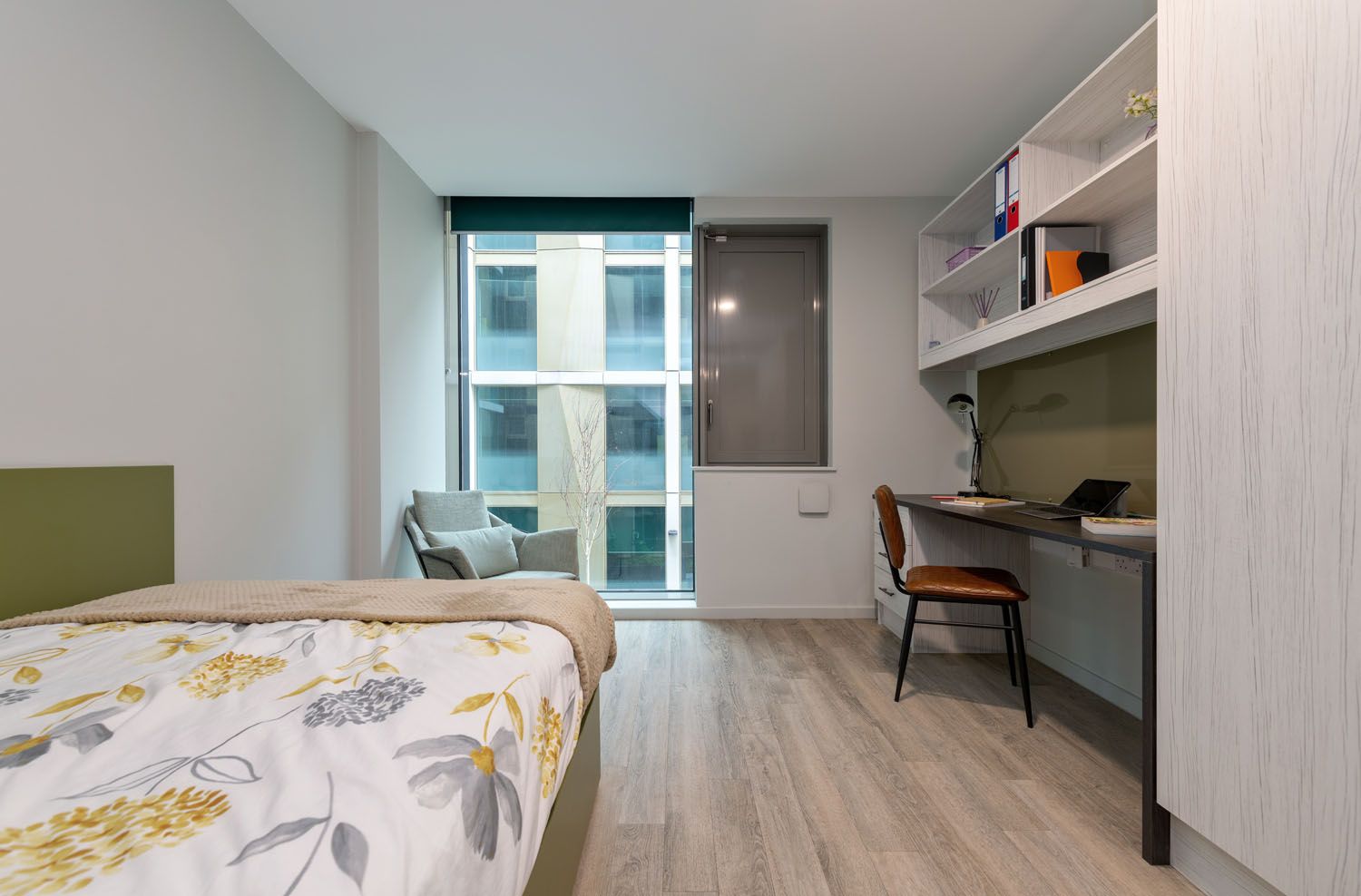 The Premium Plus Studio offers a spacious and upgraded student living experience. Enjoy a ¾ double bed with under-bed storage, a study desk and chair, a wardrobe, and plenty of storage with drawers and shelving. Your private kitchen includes ceramic hobs, combi oven, fridge freezer, and a dining table with chairs, plus an en-suite bathroom and air conditioning for comfort all year round.