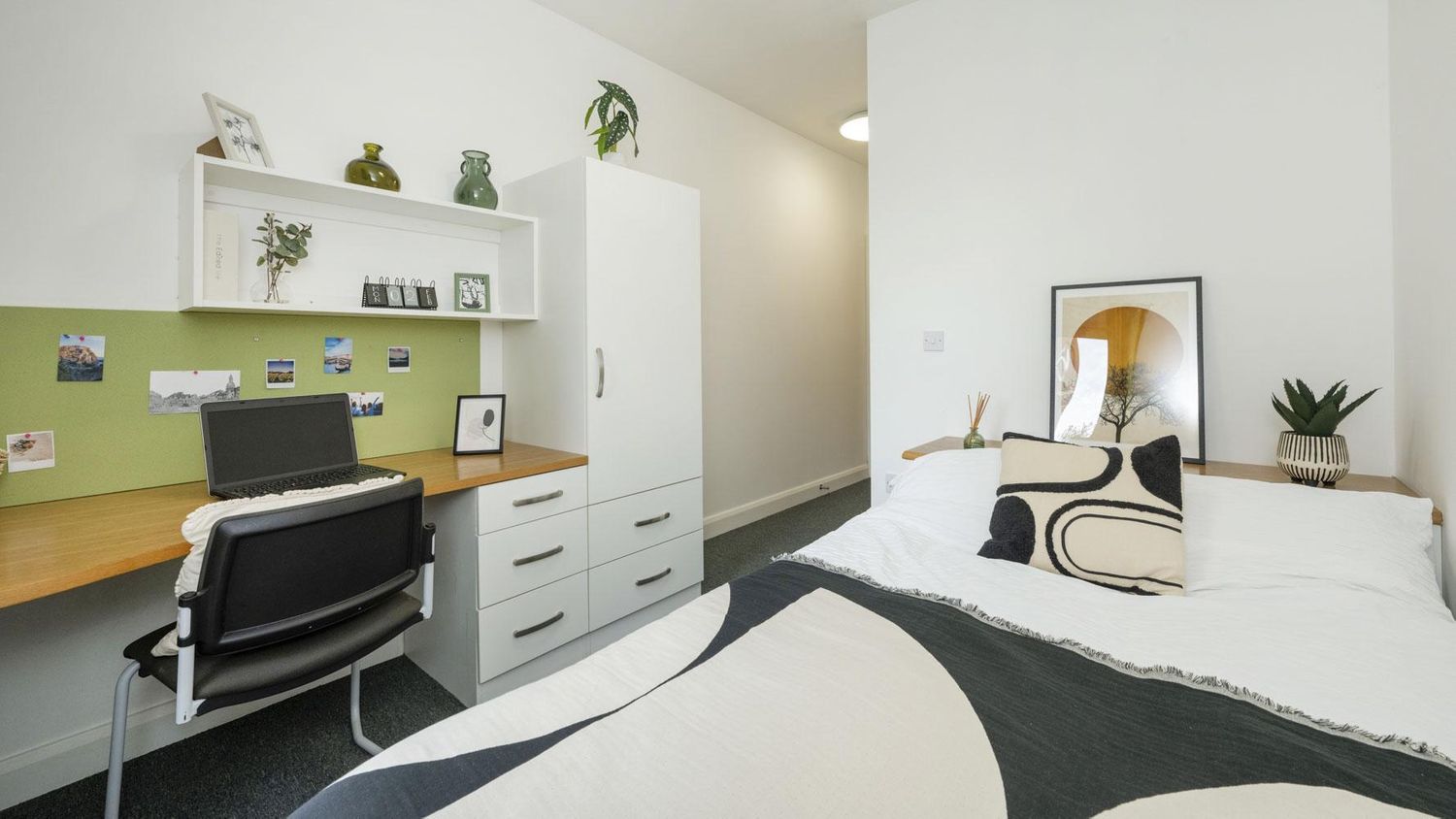 Classic En-suite rooms (approx. 12.9 – 17.4 m²) combine privacy and functionality. Each room features a double bed with under-bed and headboard storage, USB charging point, double wardrobe, full-length mirror, and a study desk with chair. The private en-suite bathroom includes a shower and WC for comfort and convenience. Residents share a fully equipped kitchen and social area within the flat.